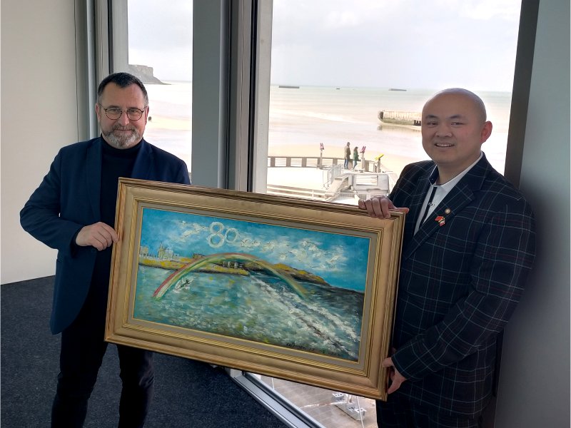 在第三届【诺曼底中法文化节】2024年 3月 23日 中法文艺晚会中,蔡先生将其象征中法文化桥梁的“和平彩虹桥”油画赠送给 法国阿罗芒什“登录博物馆” (Musée du Débarquement),它们欣然接纳收藏